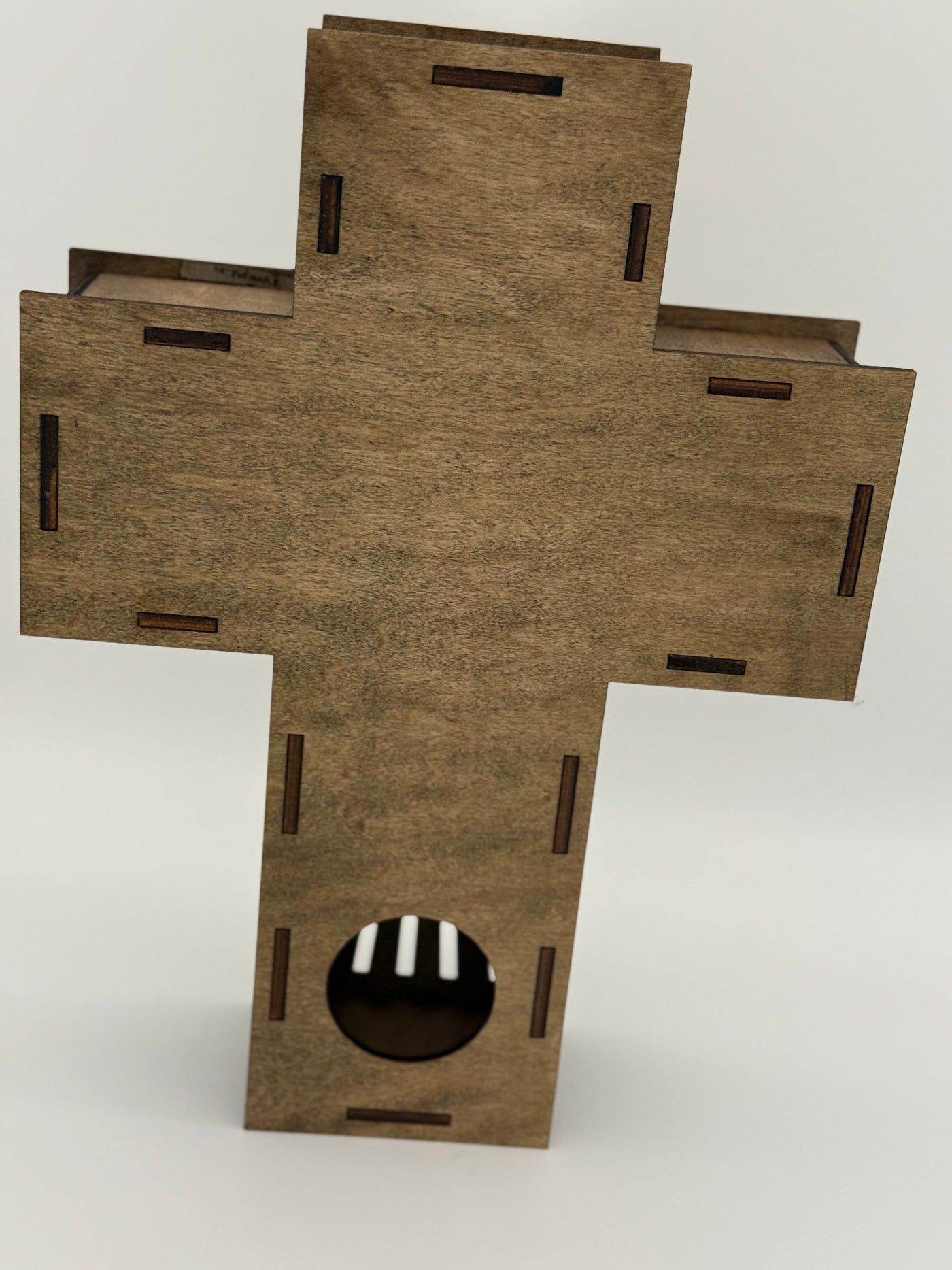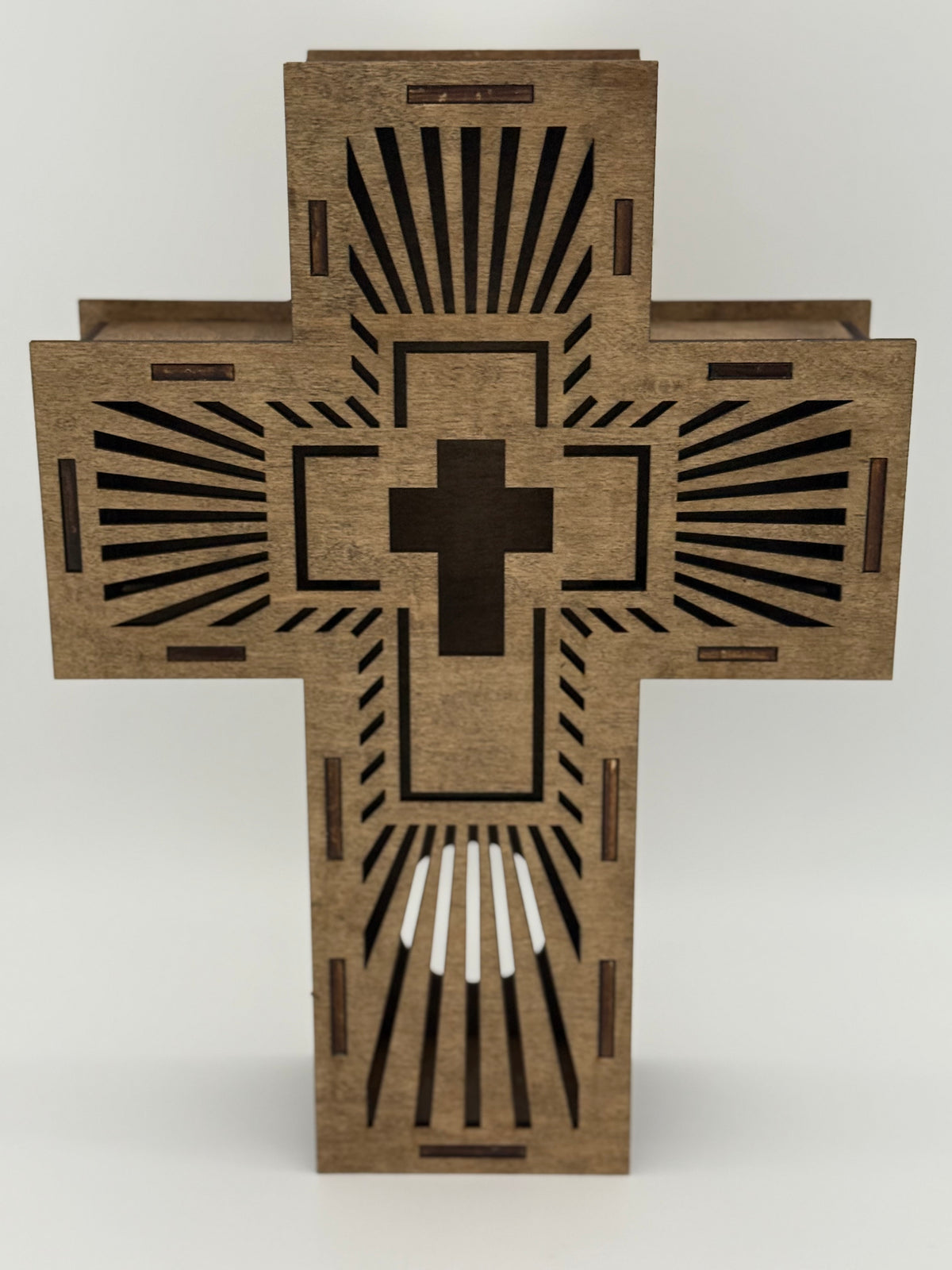 Transform your sacred space with this stunning handcrafted wooden cross featuring intricate laser-engraved sunburst rays that come alive with divine light. Add a battery-operated LED tea light (not included) to create a breathtaking illuminated displaythat radiates warmth and spiritual presence throughout your room.
